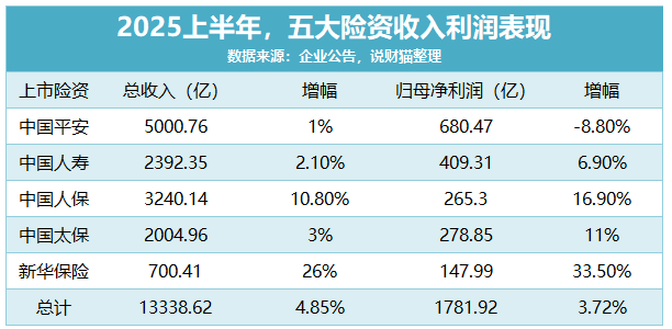 2025上半年,五大险资累计净利润1782亿,增幅约3.72%。