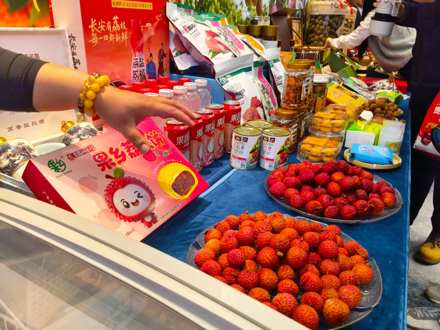 “‘十四五’广东成就”茂名专场新闻发布会现场展出的荔枝相关产品,郭莎/摄